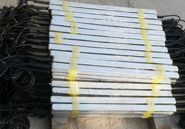 我公司生產(chǎn)的鋅接地電池由平行靠近的一對(duì)或四支鋅合金犧牲陽(yáng)極棒組成,中間用絕緣墊塊隔開(kāi),然后一起裝在裝有填包料的棉布袋中,通過(guò)引出電纜焊接在絕緣裝置(絕緣接頭或法蘭)的兩側(cè),以防止強(qiáng)電沖擊引起的損壞,同時(shí)日常情況下接地電池也可對(duì)管道起保護(hù)作用。